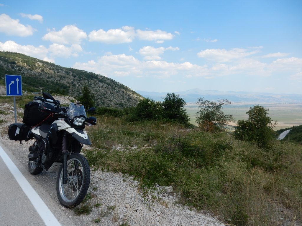 Nun ging es auf kroatischer Seite weiter nach Süden. Die Landstraßen ebneten sich in weit gezogene Täler, in denen die Hitze stand. Die Strecken waren zwar gut ausgebaut und man kam schnell voran, aber es waren auch keine landschaftlichen oder fahrtechnischen Delikatessen mehr dabei. Weite Ebenen, Kurven, die man vielleicht mit einem Sportmotorrad als Kurven empfinden könnte und ab und zu ein Kreisverkehr im Nichts, der für Abwechslung und Neugierde sorgte: