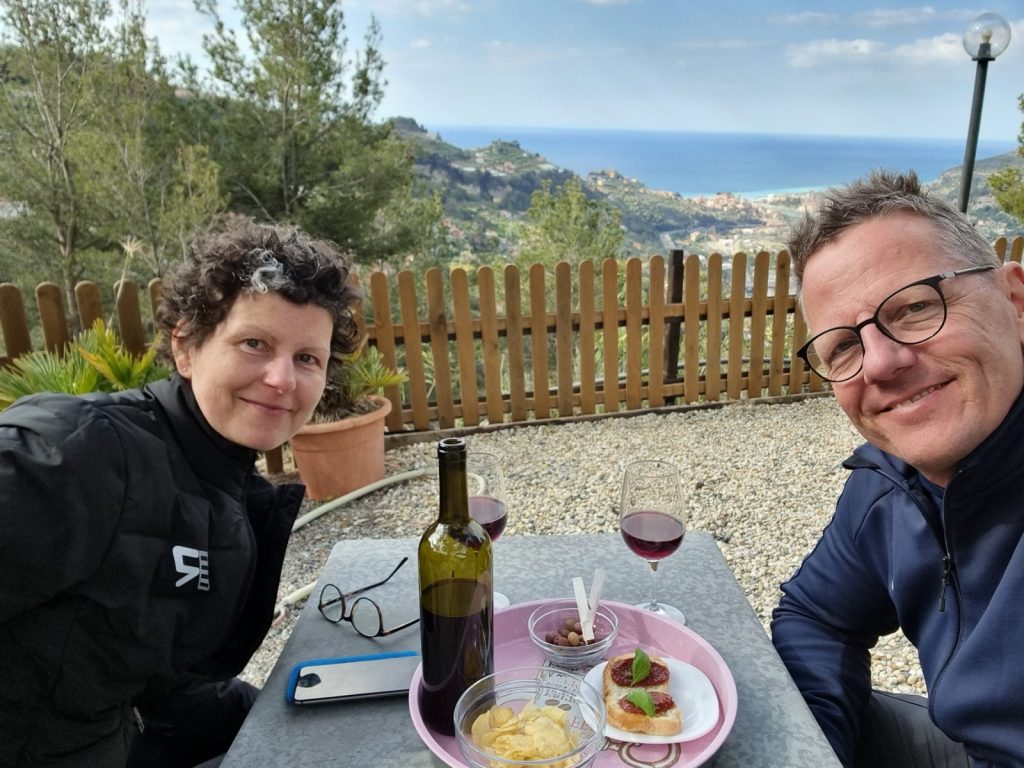Unsere Gastgeber Massimo und Francesca haben uns geich mit einer Flasche Rotwein versorgt und wir haben den Nachmittag mit Aussicht über Ventimiglia genießen können.