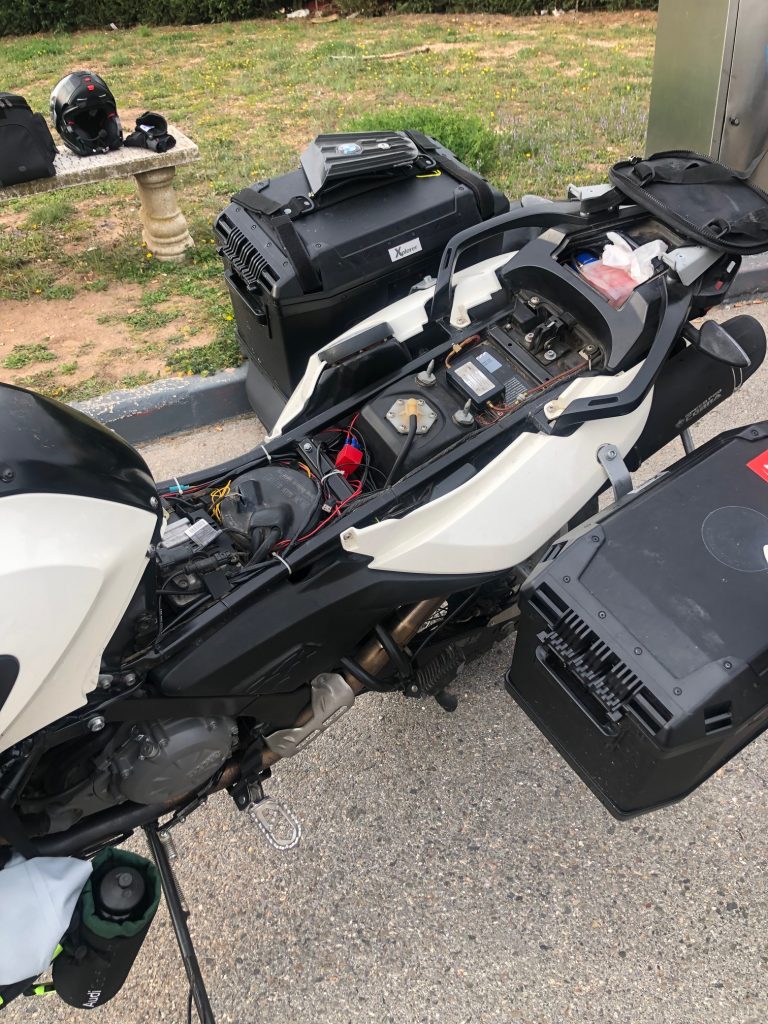 Gepäckrolle runter, Werkzeugtasche ab, Sitzbank runter und nach dem Kettenöler schauen, der neben dem Motoröl der einzige Kandidat sein könnte, der Öl „verteilt“. Ja, und da war der Öltank des Kettenölers schon fast leer… Nach jetzt 2300 km? Der sollte eigentlich für 10 – 15 tausend Kilometer gut sein.