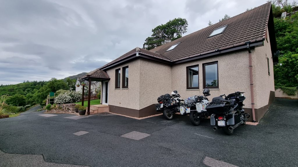 Für die Nacht suchten wir einen Campingplatz mit festen Hütten, die man mieten kann. Leider Fehlanzeige und das Wetter lud nicht auf eine Zeltübernachtung ein. Spätestens als uns der intensive Regen die Arbeit mit dem Smartphone vereitelte (Regentropfen wirkten wie Fingerprints), buchten wir schnell ein nahe gelegenes B&B in Gairloch und bereuten diesen Schritt keine Minute.