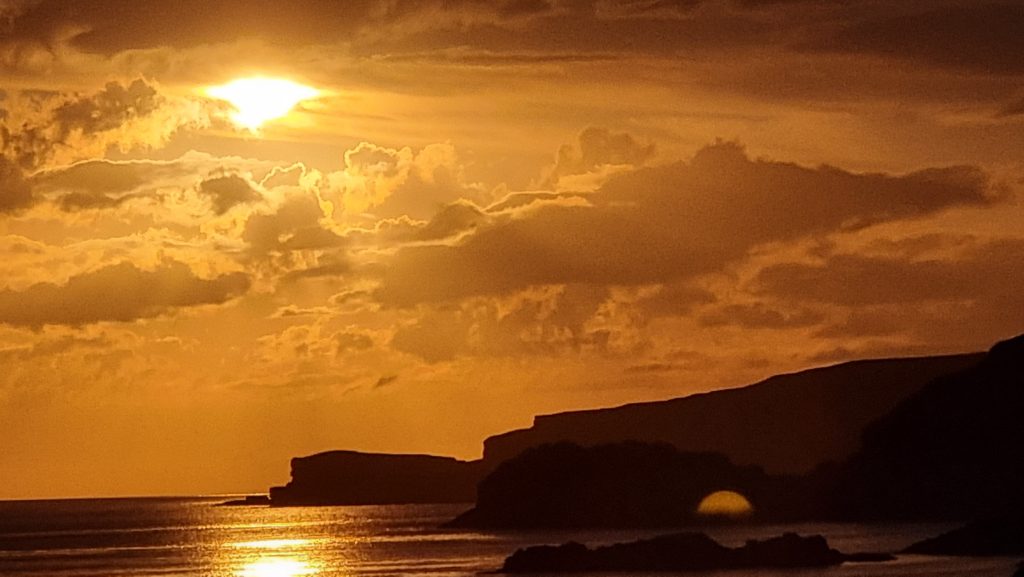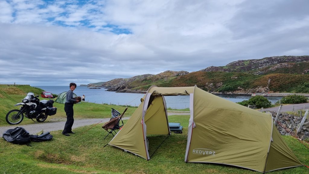 Ein uns empfohlener Campingplatz lag in Scourie. Diesen fuhren wir an und konnten nur die Empfehlung bestätigen. Ein Supermarkt mit „integriertem“ Pub war direkt vor der Einfahrt in den Campground situiert und eine 24/7 Tankstelle zwei Steinwürfe entfernt. Die Stellebenen für die Zelte terrassierten sich zur Bucht hinunter und boten einen wunderbaren Ausblick auf Meer und Sonnenuntergänge. Perfekt!