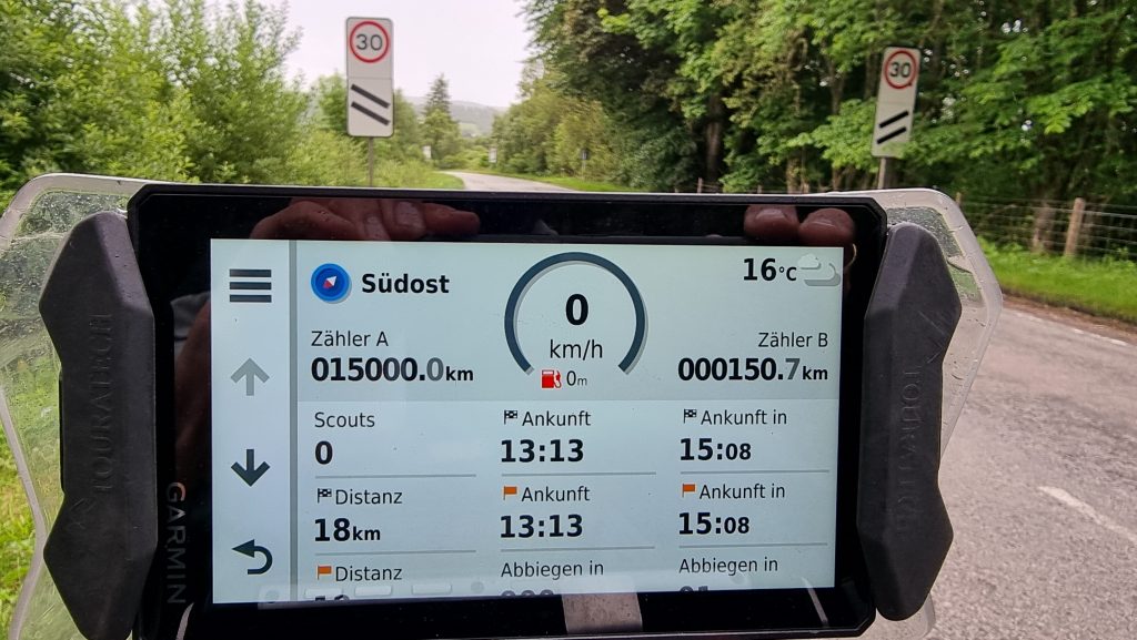 Kurz vor der Tank- und Mittagspause knackten wir dann unsere 15.000 km – Marke! Respekt, nominell haben wir damit jetzt die Hälfte der Strecke absolviert! Ich zweifle ein wenig, ob am Ende der Reise vielleicht doch noch ein paar Kilometer mehr auf der Uhr stehen werden. 🫢