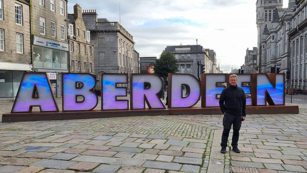 Gegen 17 Uhr kamen wir nach etwas Suche bei unserem „Vermieter“ in Aberdeen an, duschten und bestiegen kurz später den Bus in die Stadt. Bei Sonnenschein hätte man wohl den silbrigen Effekt der Natursteinfassaden wahrnehmen können, aber der hatte heute leider schon Feierabend. Die wenigen Sehenswürdigkeiten (oder war es nur eine?) waren schnell gesehen. Der mannshohe „ABERDEEN“ Schriftzug war dann doch auch noch ein Foto wert. Der Thai, bei dem wir essen waren, verdiente keine nähere Erwähnung…