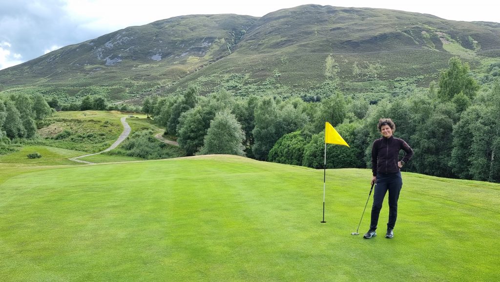 Während der Wartezeit, da wir erst nach der „Mittagsruhe“ 🙄 auf unseren Zeltplatz durften, besuchten wir in unserer Motorradklamotte den örtlichen Golfclub und fragten nach den Konditionen für eine Runde Golf mit Leihausrüstung. Man kann als Golfer ja nicht einfach von der Insel wieder flüchten, ohne nicht wenigstens eine Runde Golf gespielt zu haben. 🤭