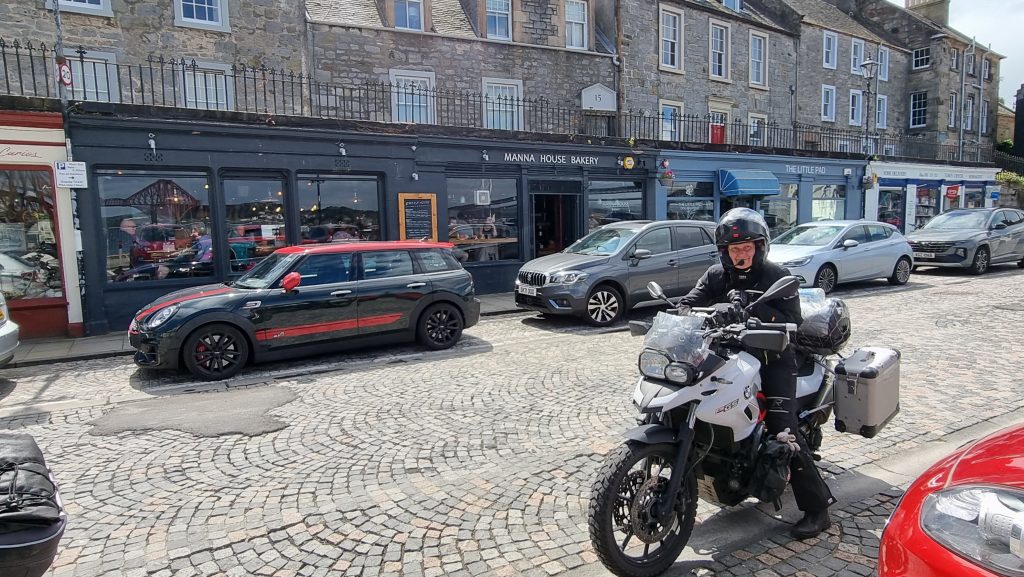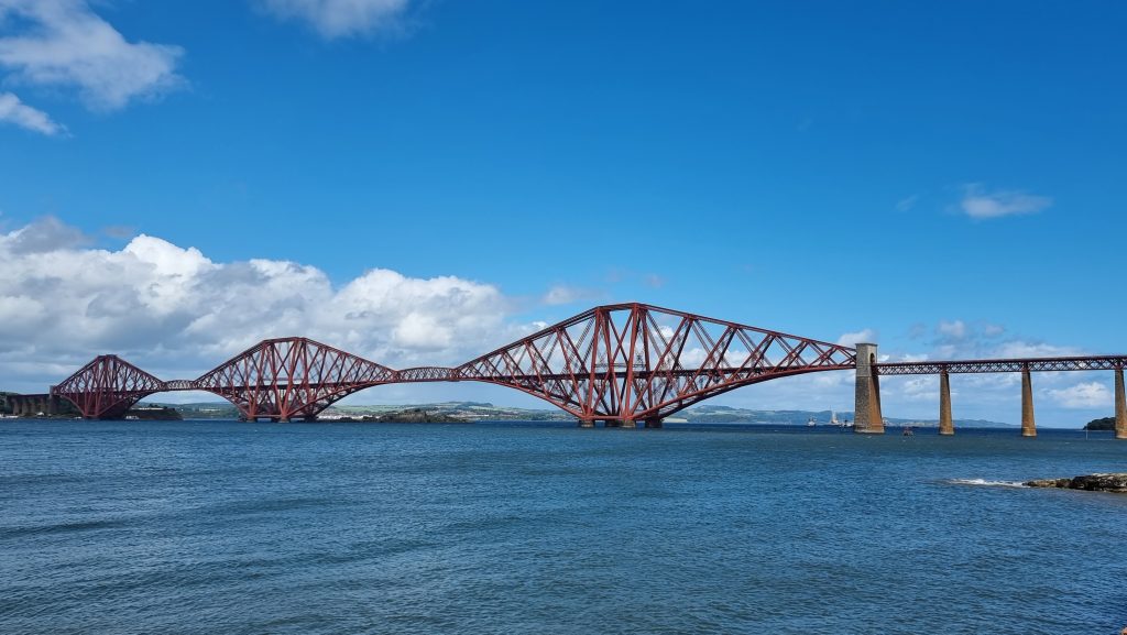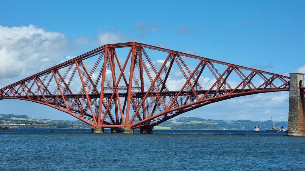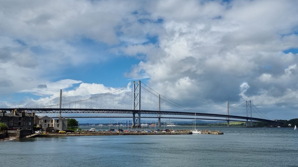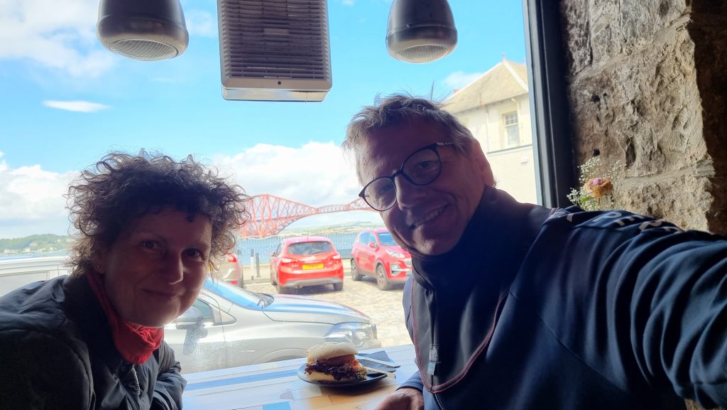 Ansonsten war die Fahrt trocken und sonnig und wir kamen schnell unserem Ziel näher. An der Fourth Bridge angekommen fanden wir ein wunderschönes Café, an dem wir pausierten und einen Platz im Schaufenster einnahmen. Ideale Pause, um danach in Edinburgh einzuziehen. 👍