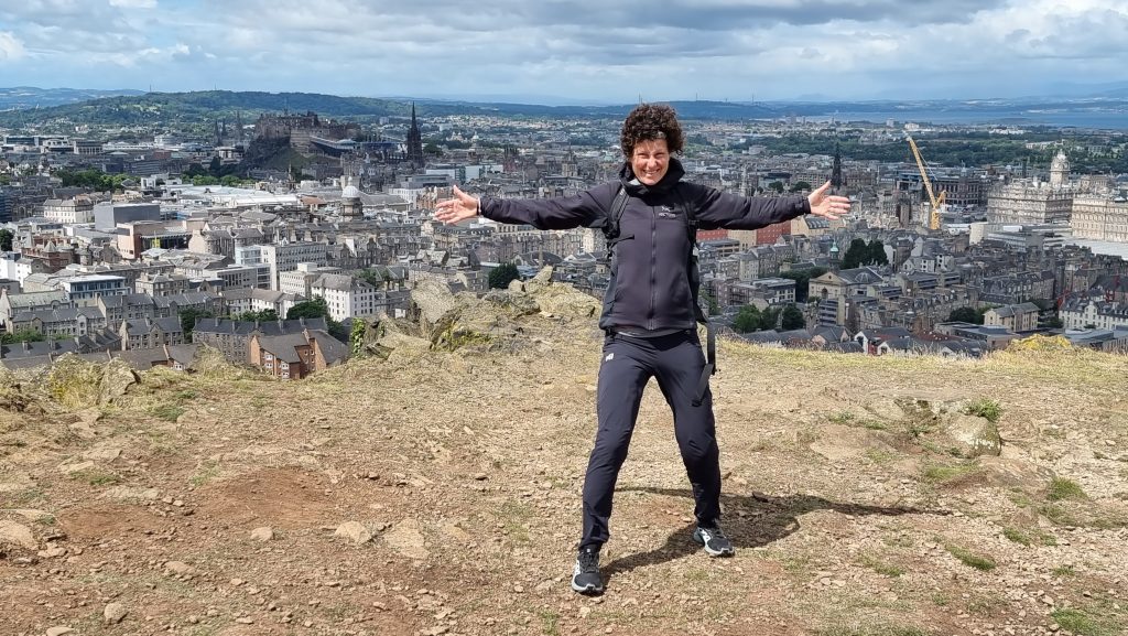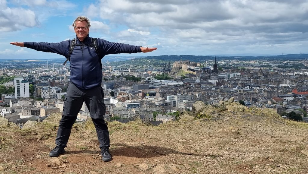 Erster Halt war noch auf dem Hinweg in die Stadt ein markanter Hügel, der vorgelagert zum Arthur´s Seat im Hollyrood Park, einen sehr schönen Blick auf Edinburgh bot. Bei starkem Wind sind wir eine halbe Stunde dort hoch gelaufen und haben den großartigen Ausblick genossen.