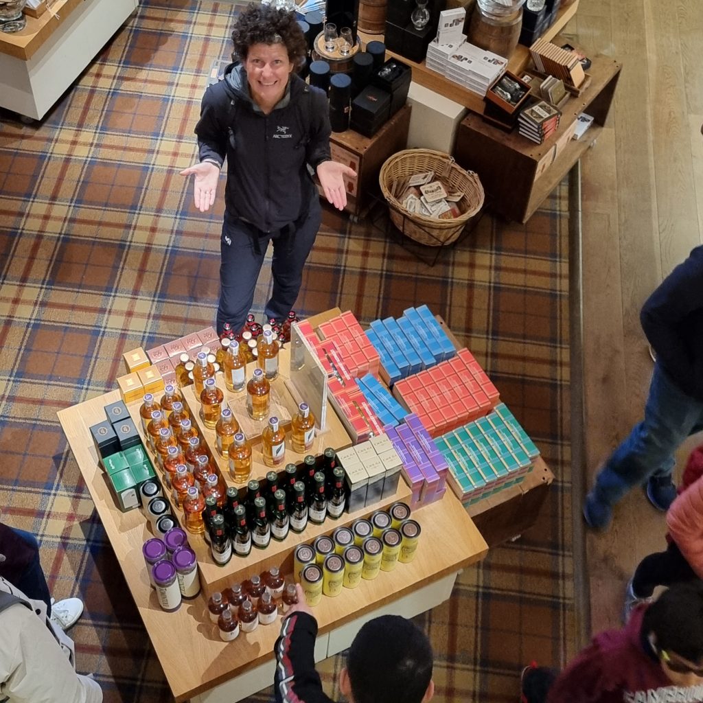 OK, in einem Showroom, wo es Whiskyflaschen für über 1000 Pfund (pro Flasche!, nicht das Fass!) zu kaufen gibt, erwartet man stubenreine und trockene Kundschaft. Das waren wir in diesem Falle nicht, also sahen wir auch vom Kauf einer dieser Flaschen ab. 😂😂😂