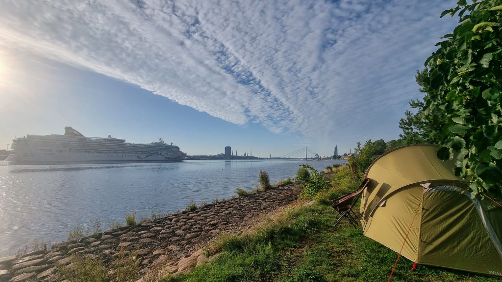 Nun, noch nachgereicht zum Zeltplatz in Riga: Am Morgen hat ein großes Kreuzfahrtschiff am Kreuzfahrtterminal angelegt und dabei mal kurz auf dem Fluß umgedreht. Schon imposant das Ganze, wenn so ein Koloss mit sicher 200 m Länge mal schnell dreht… ☝️🤓