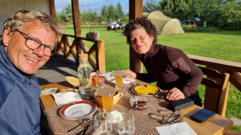 Ein hervorragendes Frühstück für kleines Geld läutete einen „Fresstag“ bei uns ein. Ein Omelette für Arlett, Pankakes mit Joghurt und Jam für mich. Dazu frische Tomaten und Gurken, selbstgebackenes Brot, Apfelsaft aus dem Obstgarten und ordentlicher Kaffee. Die gute Nachricht: Die Druckknöpfe der Hosen ließen sich trotzdem noch schließen!