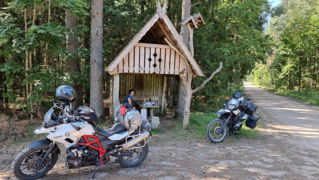 Unauffällige Landschaften, ein paar Erhebungen, viele kilometerlange Geraden, aber auch mal ein schönes Stück durch den Wald, das wir sofort für ein Picknick nutzten.