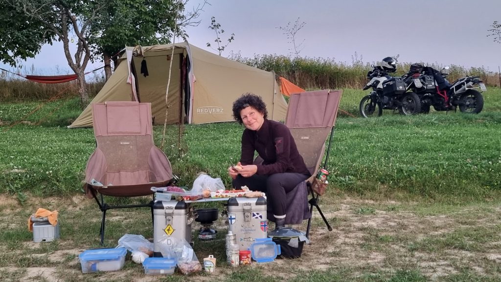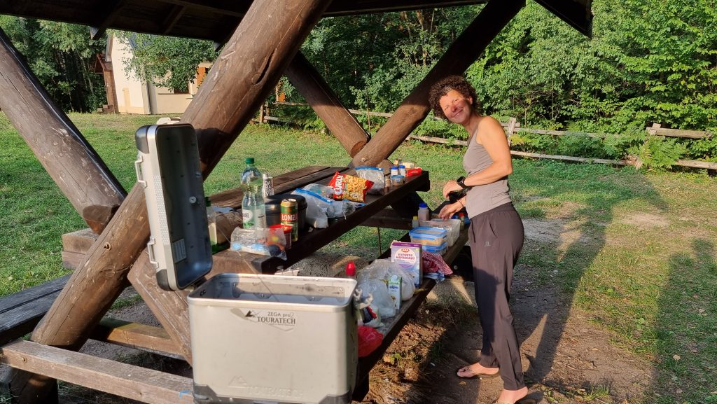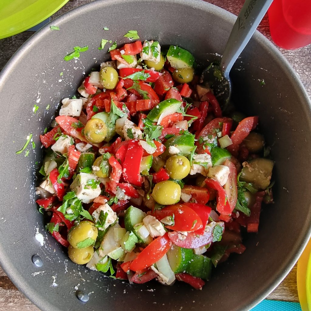 Trotzdem haben wir einen akzeptablen Platz für unser Zelt gefunden, sind unter die kalte Dusche gesprungen und haben uns einen großen Topf Griechischen Salat gemacht. Was anderes hätten wir bei den Temperaturen gar nicht haben wollen. ☝️😀🌞