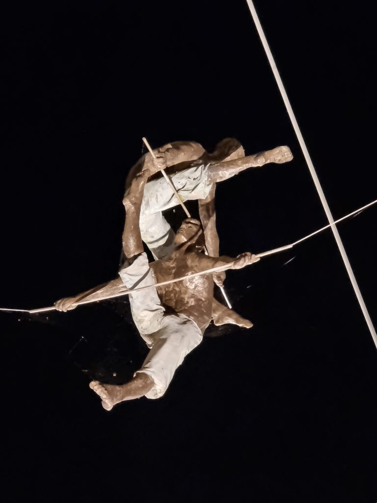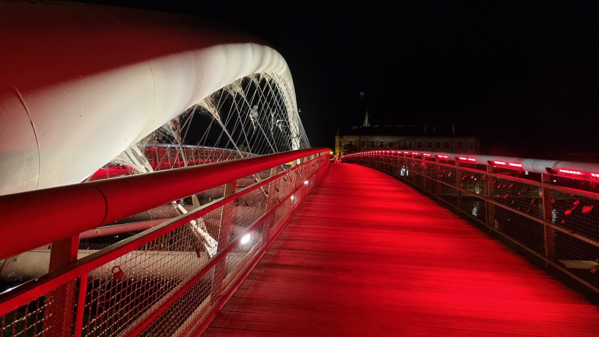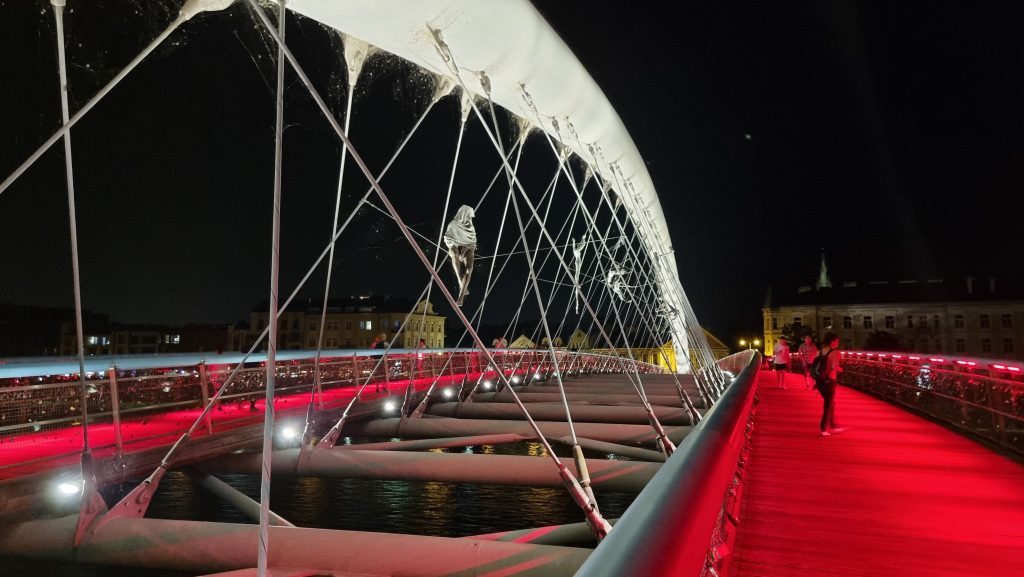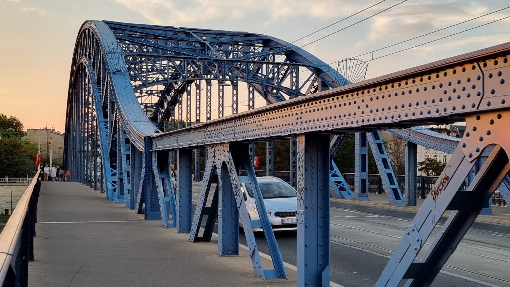 Um Mitternacht machen wir uns über die „Bridge Of Locks“ auf unsere Seite der Weichsel und bestaunen dabei die Brücke mit ihren Figuren, die zwischen die Abspannseile eingebaut sind…