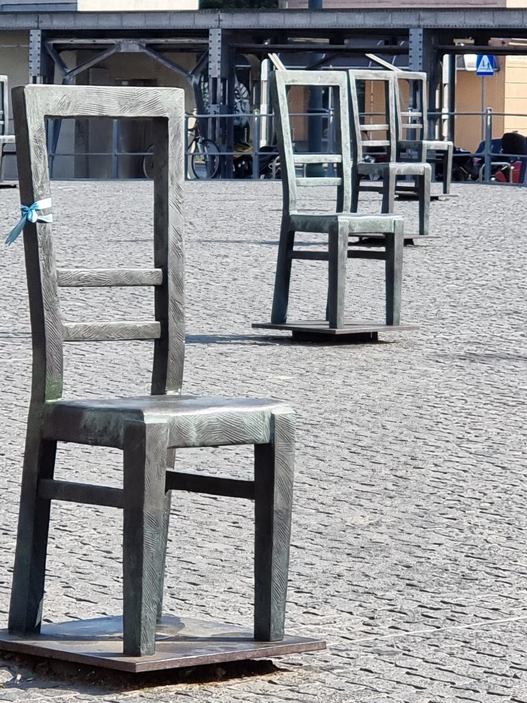 Den Weg dorthin wählten wir unter anderem über den Platz der Helden, der für die stillen Ghetto-Helden des damaligen Widerstands der Juden im Ghetto stand und an dem Ort errichtet worden war, an dem die Juden zur Deportation zusammengetrieben wurden. Der Platz wurde mit leeren, übergroßen, metallenen Stühlen definiert. Sie sollen an die Möbel und das Gepäck erinnern, welche nach Auflösung des Ghettos zurückgelassen werden mussten.
