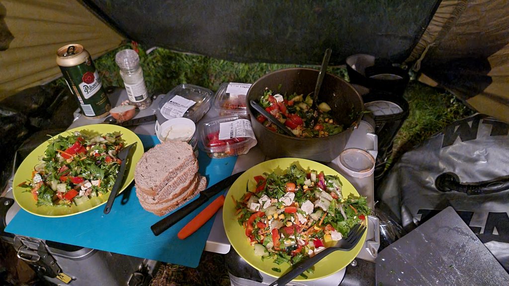 Wir fuhren unseren ausgewählten Campingplatz relativ spät am Abend an und fanden ein Plätzchen für uns. Eine Dusche und ein großer, frischer Salat war die Belohnung für den ereignisreichen Tag. 😋