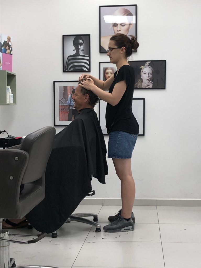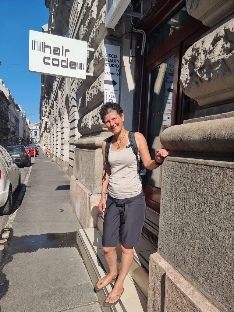 In einer Seitenstraße war es dann soweit: Der Blick durchs Schaufenster eines Friseurladens mit der zeichensprachlichen Frage, ob hier und jetzt ein Schnitt möglich wäre, wurde von einer freundlichen Friseurin positiv beantwortet. Ich kam also unters Messer und eine dreiviertel Stunde später hatte ich wieder eine „ordentliche“ Sommerfrisur.