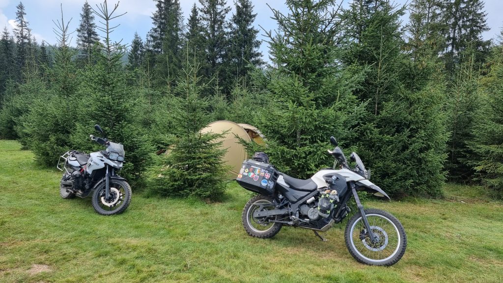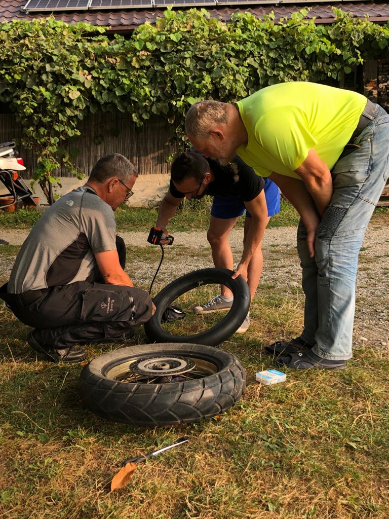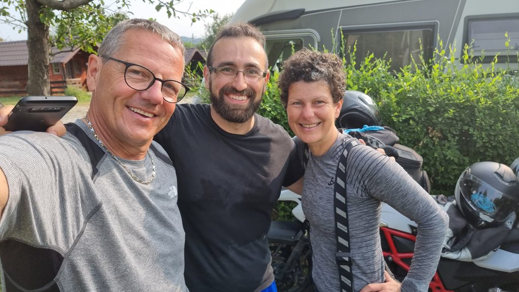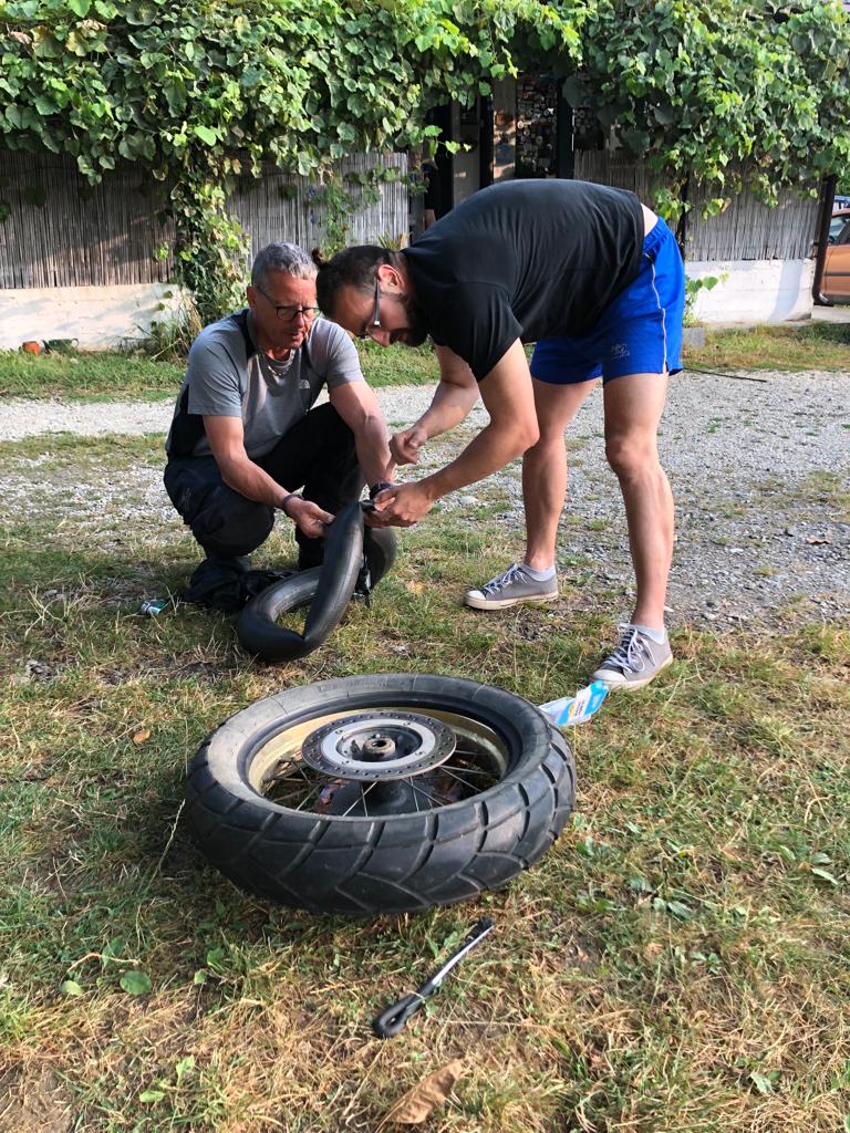 Der Morgen begann mit Überraschungen. Der bulgarische Zeltnachbar Kosta, mit dem wir uns am Vortag ausgiebig austauschten, kam irgendwann in der Nacht mit einem Plattfuß an seinem Hinterreifen am Zeltplatz an. Heute Morgen erzählte er sein Abenteuer, wie er „nach Hause“ gekommen war.