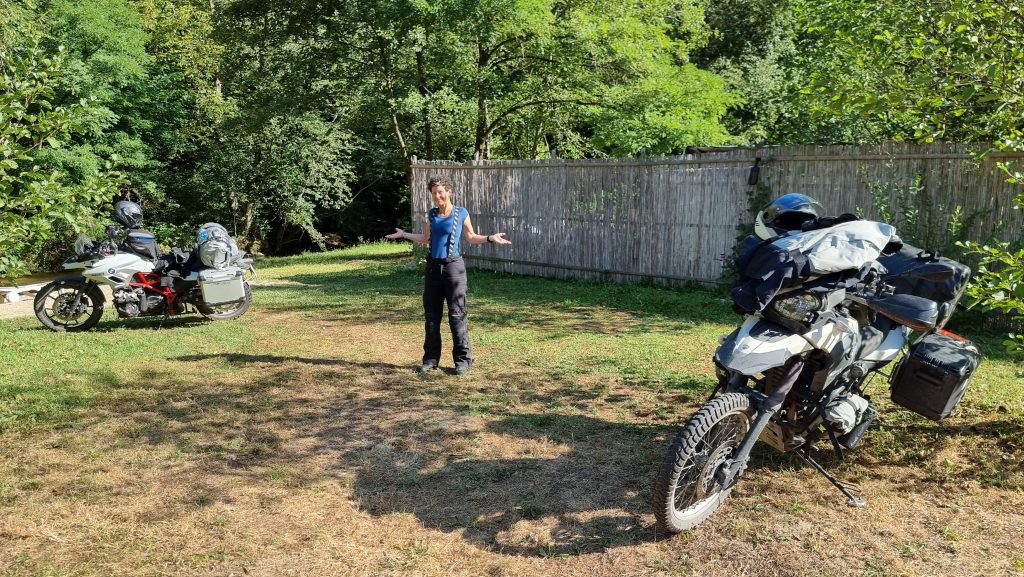 Das Foto unseres Zeltplatzes gab es leider nur ohne Zelt. Das standardmäßige Zeltfoto haben wir schlichtweg vergessen! 😂 Also stellt euch einfach unser Zelt an diesem Platz zwischen den Motorrädern vor… 👍