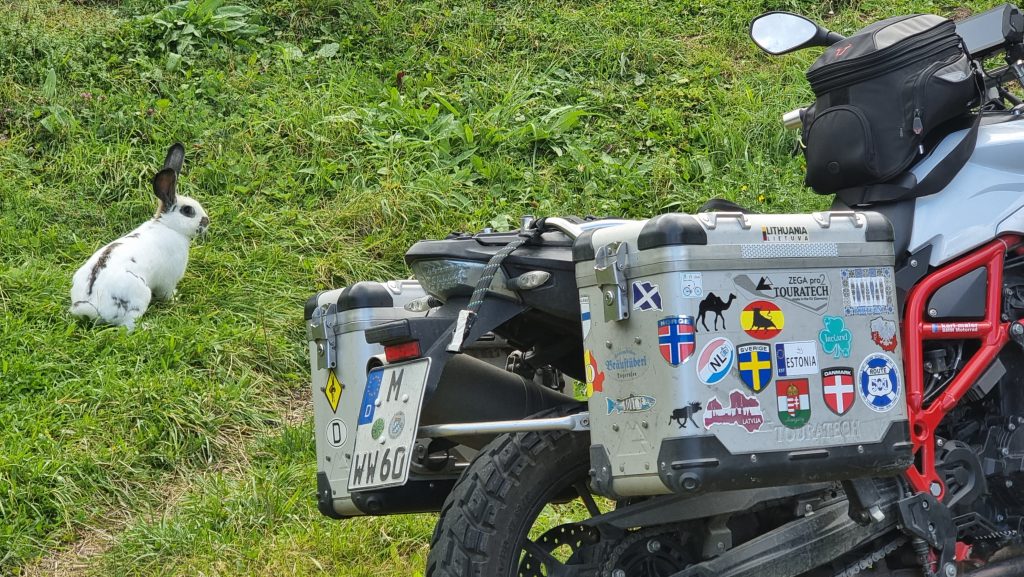 Gegenseitige Hilfe unter Motorradfahrern ist selbstredend und so half ein polnischer „Bär“ und ich ihm dabei, seinen Plattfuß zu reparieren. Kurz bevor wir fertig waren rief Arlett und deutete auf mein Pferdchen: Es hatte sich einfach hingelegt. 🫣