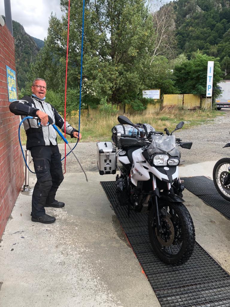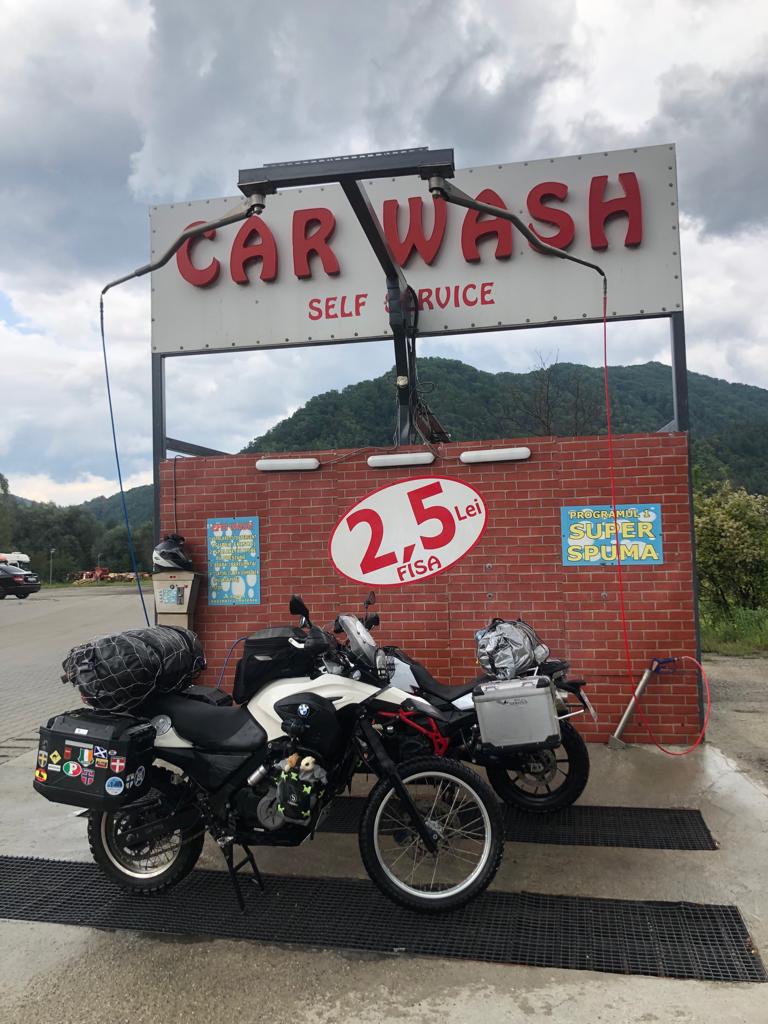 An einer Kreuzung entdeckten wir eine Kärcher-Station, an der wir unsere Ketten mal wieder vom Staub und Kettenfett befreien wollten. Wir hielten an und säuberten unsere Pferdchen und deren Geschirr 😉.