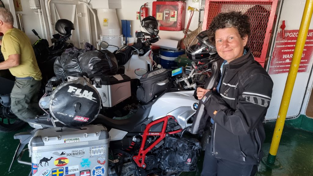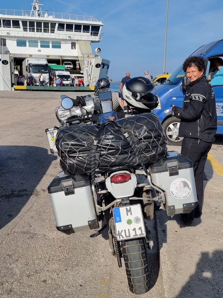 Wir kamen nach einer zweimaligen Umrundung des Hafens von Makarska pünktlich an der Fähre an. Arlett sprang vom Pferdchen und kaufte die Tickets. Da wir uns brav in die Wartespur gestellt hatten und die Fähre doch deutlich kleiner als erwartet war, beschlossen wir, uns „italien style“ anzustellen, über die Hafenmole zu tuckern und direkt an der Fähre vom dortigen Einweiser auf die Motorradplätze eingewiesen zu werden. Perfekt! The show can go on! 😍