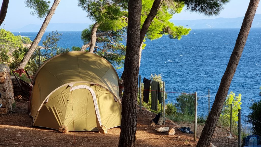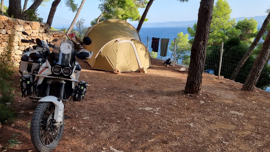 50 Minuten später enterten wir die Insel Brac und fuhren Richtung Bol, wo es mehrere gut bewertete Campingplätze geben sollte. Der favorisierte Platz war etwas im Landesinneren, gehörte einer unfreundlichen Yoga-Tante (sorry für diesen leider notwendigen Ausdruck) und war über Google etwas unglücklich über unbefestigte Wege erreichbar. Arlett wartete, um ihren Adrenalinspiegel von der Offroad-Strecke zu senken 😉, während ich zu Tante Yoga fuhr.