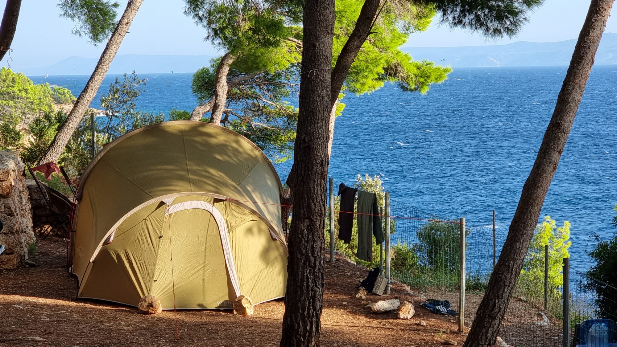 Jeden Abend und jeden Morgen genießen wir unsere unglaublich schöne Aussicht aufs Meer! Nachts ist es so still, dass man wirklich hört, wie einzelne Piniennadeln aufs Zelt fallen und dann an der Zeltwand hinunterrutschen. Das Meer ist in den letzten Tagen kaum bewegt. Nachts schläft dann auch noch der letzte Wind ein, so dass man vom Meer nicht mal die Wellen hört…