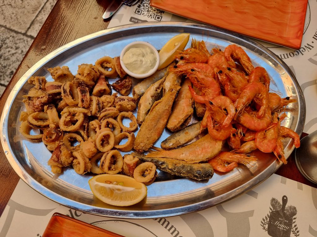 Jede Menge Kneipen und Restaurants machten es uns nicht leicht, eine ordentliche Auswahl zu treffen. Erst in zweiter oder dritter Wegesreihe vom Meer aus gesehen, fanden wir ein kleines Restaurant, das zu einigermaßen manierlichen Preisen uns eine Platte mit frisch frittierten Meeresfrüchten auf den Mittagstisch stellte. Hmmm. Sehr gut. Das Suchen hat sich gelohnt! 🤤