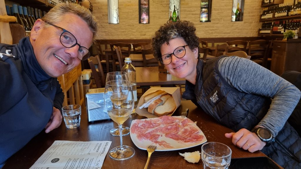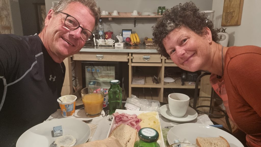 Gegen 13:30 Uhr kommen dann Daniela und Roland im Hotel an. Riesen Freude, Umarmungen und wieder was zu Essen. 😅 Für die von der Fahrt ermatteten Schweizer gibt es eine ordentliche Brotzeitplatte, bei der wir natürlich mithelfen… 😵