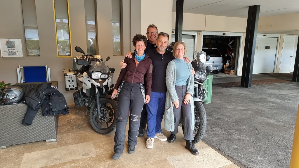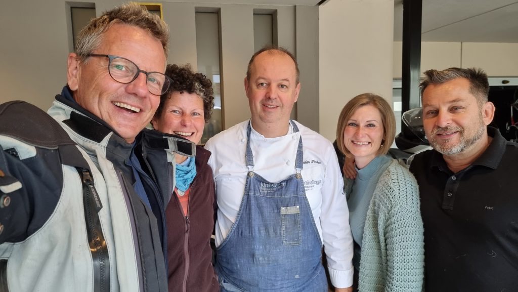 Guten Morgen! Frühstück! Endlich wieder Essen! 😂 Viel geht nicht rein, aber der Apfelstrudel am Schluss muss sein! Um 10:30 Uhr wollen wir weg. Wir verabschieden uns von Daniela und Roland. Es war leider nur ein Nachmittag und Vormittag, aber dafür von Herzen und intensiv! Noch ein Abschlussselfie mit uns allen und Christian und dann fuhren wir bei Trockenheit! los. 👍