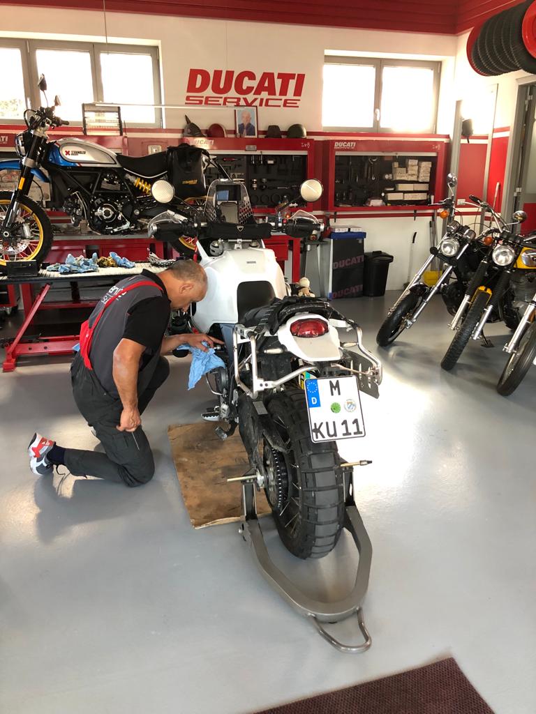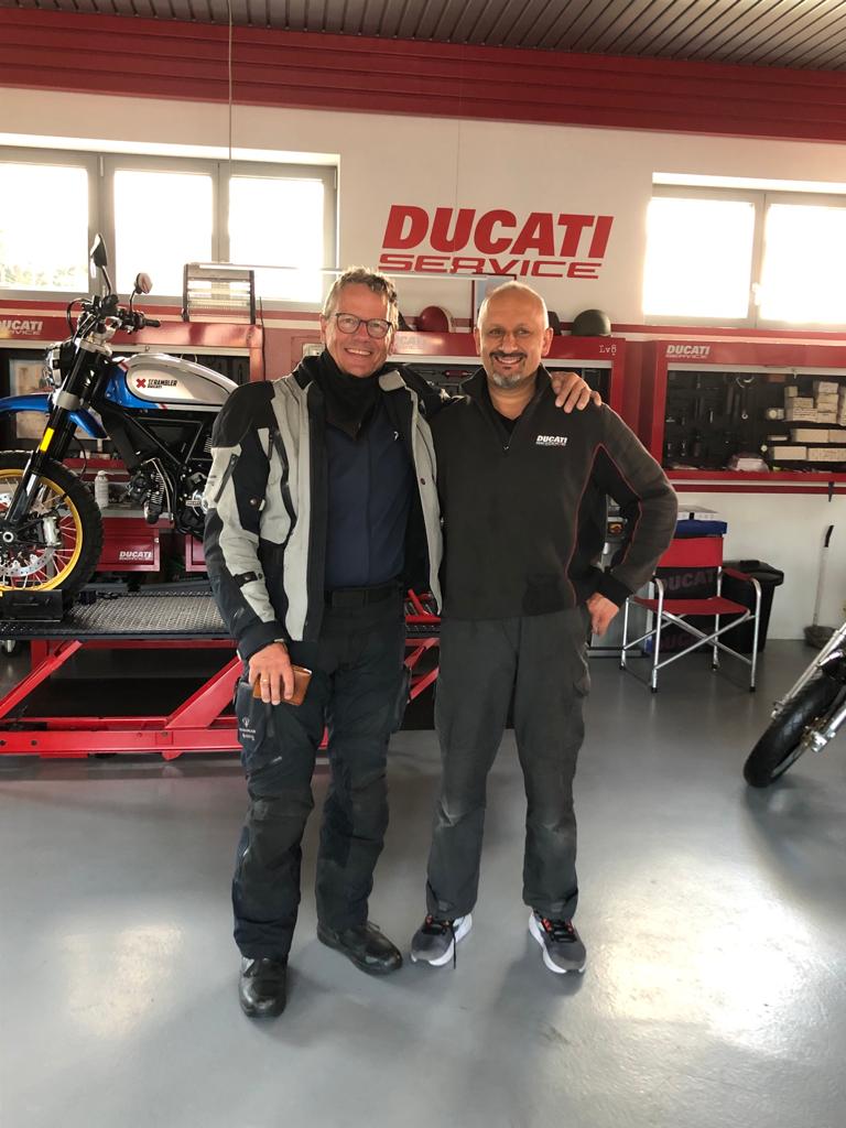 Um 08:30 Uhr hatten wir den Termin für den Jahres-Service der Desert X bei Gianluca in Cornedo Vicentino. Gianluca, hatte ich schon bei einem Besuch mit meiner Ducati Multistrada im Jahr 2020 als einen ausgezeichneten Ducati-Mechaniker kennengelernt. Und wir erfuhren, dass er heute seinen Geburtstag hatte. Na dann alles Gute Gianluca!