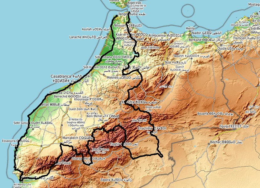 Von Marrakesch wird noch einmal der Atlas in südlicher Richtung nach Agadir überquert, um dann von dort am Atlantik entlang wieder in den Norden zu gelangen. Die Marokko-Rundtour wird über 3.500 km lang sein.