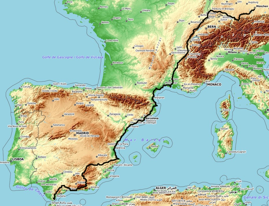 Der erste Teilabschnitt unserer Reise wird auf kurzem Weg und über kleine Straßen nach Gibraltar führen. Je nachdem, wie sich das Wetter Anfang April präsentieren wird, ist natürlich eine Durchquerung der Alpen alternativ möglich. Wir werden kurzfristig entscheiden, wie wir die etwas über 3.000 km lange Route angehen werden. Die aufgezeigten Strecken dienen uns als „Leitlinien“, an denen wir uns eigentlich nur orientieren wollen. Zuviele schöne Strecken im Landesinneren locken vom Meer weg und sind unter Umständen die bessere Alternative.