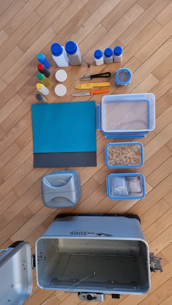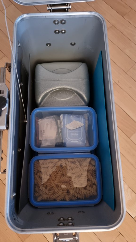 Riesi hat sich zu einer Perfektionistin beim Packen des Küchenkoffers entwickelt. Hut ab, denn so perfekt, wie dieser schmale Seitenkoffer gepackt ist, das sucht seinesgleichen…