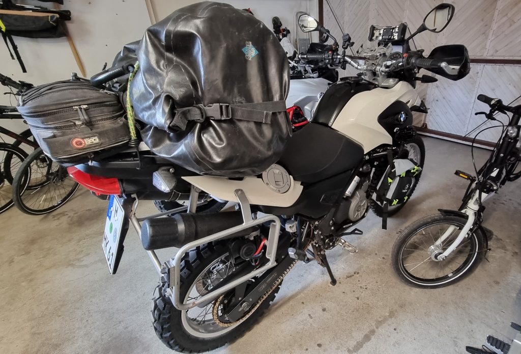 Die obligatorische Rolle auf der hinteren Sitzbank / Gepäckträger beinhaltet Zelt, Kocher, Kochgeschirr, ein Köcher mit zwei Angeln 😮, unsere Helinoxstühle, die wir noch kurzfristig auf Ebay-Kleinanzeigen ersteigern konnten, Schlafsäcke, Isomatten und Gegenstände, an die wir nur ran müssen, wenn wir irgendwo das Zelt aufschlagen wollen.