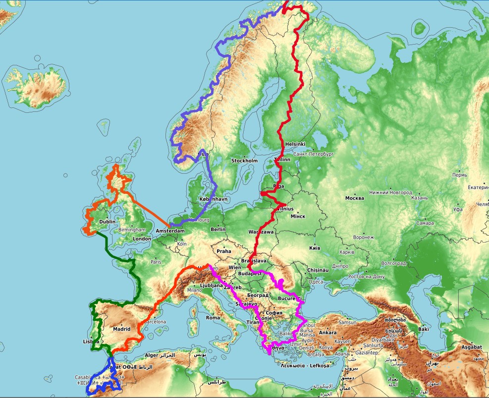 DEUTSCHLAND – SCHWEIZ – FRANKREICH – SPANIEN – GIBRALTAR – MAROKKO – SPANIEN – PORTUGAL – SPANIEN – FRANKREICH – IRLAND – SCHOTTLAND – ENGLAND – NIEDERLANDE – DEUTSCHLAND – DÄNEMARK – SCHWEDEN – NORWEGEN (über die Lofoten und das Nordkap) – FINNLAND – RUSSLAND – ESTLAND – LETTLAND – LITAUEN – POLEN – SLOWAKEI – UNGARN – RUMÄNIEN – BULGARIEN – TÜRKEI – GRIECHENLAND – ALBANIEN – NORDMAZEDONIEN – SERBIEN – MONTENEGRO – BOSNIEN – KROATIEN – SLOWENIEN – ÖSTERREICH – DEUTSCHLAND.